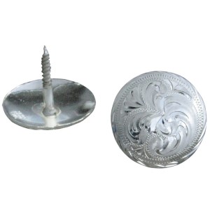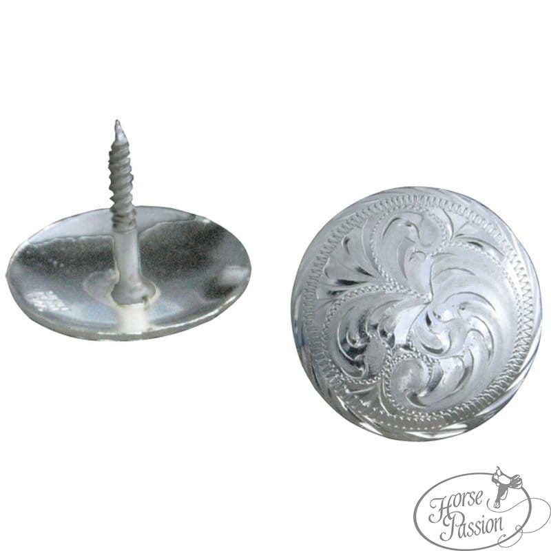 Concho westernowe wkręcane — srebrny stop metalu z grawerem scrollwork/kwiatowym, mocowanie na gwintowaną śrubę screw back (montaż śrubokrętem bez rymarza). Dostępne w rozmiarze 1" (2,5 cm) i 1 1/2" (3,8 cm). Do renowacji siodła, ogłowia, napierśnika i projektów kaletniczych.