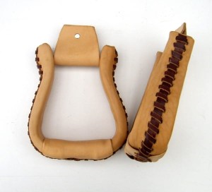 Strzemiona westernowe skórzane dwukolorowe jasne kasztan drewno obciągnięte skórą, oplot ręczny