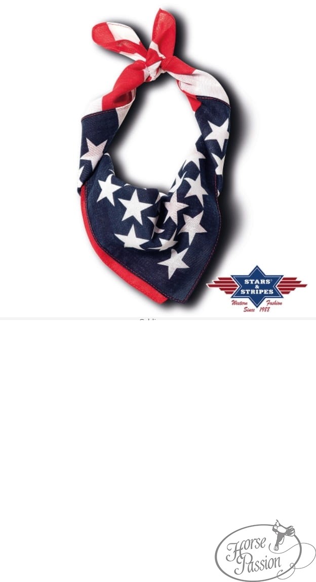 Bandana western flaga USA Stars & Stripes — 100% bawełna, 54x54 cm, wzór flagi Stanów Zjednoczonych: czerwono-biało-granatowa z białymi gwiazdami. Jako chusta na głowę, apaszka na szyję lub opaska na ramię — klasyczny american western look. Marka Stars & Stripes western fashion od 1988.