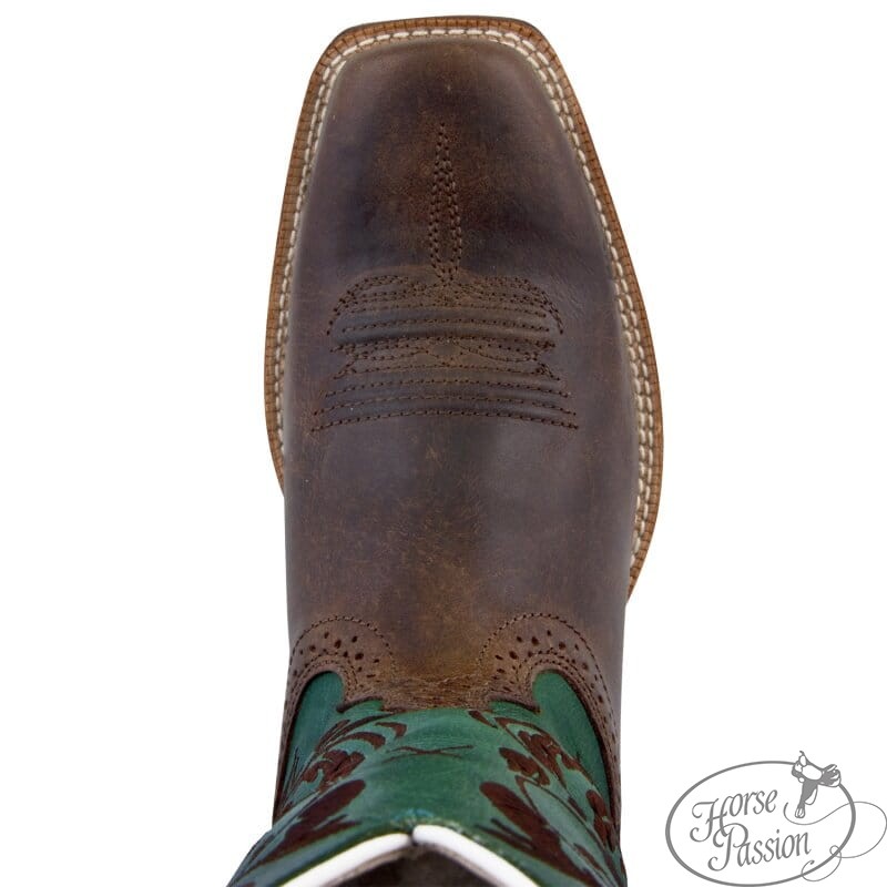 Vamp z brązowej skóry bydlęcej z charakterystycznym wykończeniem — odporny na zarysowania i codzienne użytkowanie w stajni. Cholewka 13" w kolorze turkusowym z grawerowanym haftem winorośli w ciemnym kontraście — wyjątkowy detal który wyróżnia model na tle standardowych kowbojek. Biały skórzany piping wzdłuż boków i kołnierza to klasyczny element show-western nadający butowi elegancji. Pętelki łzowe (teardrop pull holes) ułatwiają wciąganie bez niszczenia cholewki. Wyjmowana wkładka CellSole z technologią przeciwbakteryjną i odprowadzającą wilgoć — można prać w pralce. Podeszwa gumowa z wzorem, obcas 1,25" z półką na ostrogę.