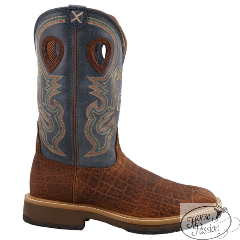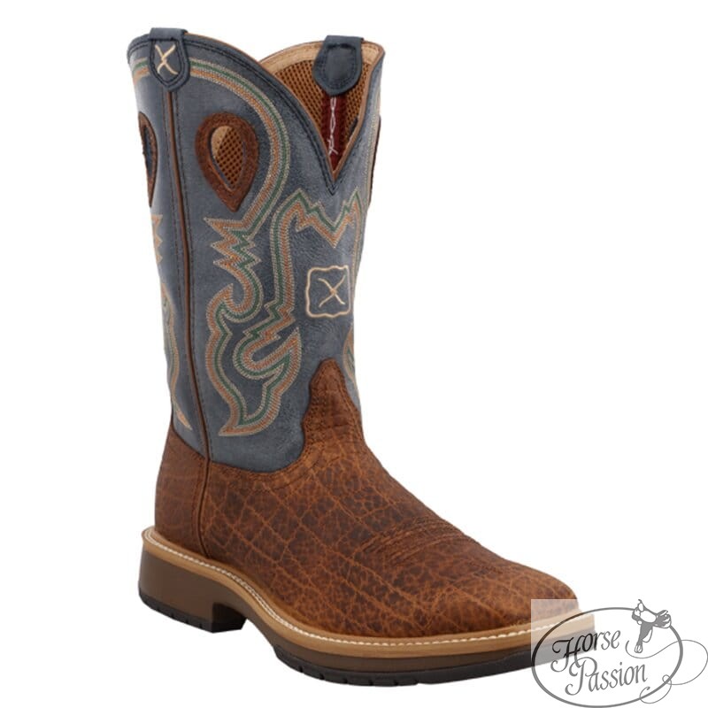 Buty kowbojskie męskie Twisted X Horseman — skóra bydlęca z teksturą, cholewka 12" slate blue z haftowanym wzorem, kwadratowy nosek. Wkładka CellSole® z technologią CellStretch®, podeszwa EVA, gumowa outsole odporna na olej i poślizg. Obcas 1,5". Dostępne wyłącznie do przymiarki i zakupu stacjonarnie w Ranch Syberia k. Łodzi — bo kowbojki dobiera się na stopę, nie na zdjęcie.