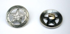 Concho okrągłe antique brass z gwiazdą texaską (większy rozmiar 37 mm): concho gwiazdka antique brass (e122-106-s). Concho wkręcane screw back scrollwork: concho wkręcane (e122-005). Śrubki chicago do akcesoriów: śrubki Chicago zestaw (s70-61).