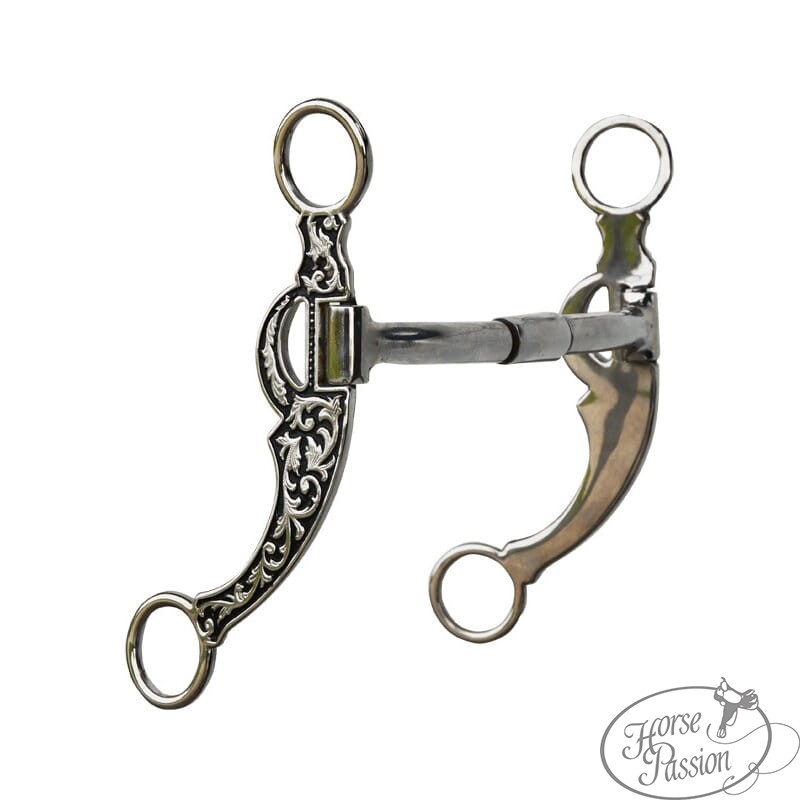 Nakładka na ozdobnej czance wykonana jest ze stali z grawerowanym wzorem acanthus scrollwork — klasycznym motywem zachodnioamerykańskiego siodlarstwa zdobniczego — z wypełnieniem czarną emalią dającym kontrast między rzeźbionym tłem a srebrnym reliefem. Efekt jest graficznie wyrazisty i dobrze widoczny z odległości ringowej. Ścięgierz zachowuje mechanizm Billy Allen: podwójnie łamany z swobodnie obracającą się centralną rolką (barrel roller) absorbującą ruch przy jednostronnym sygnale wodzy. Dzięki temu koń pracujący dotychczas na snaffle nie odczuwa gwałtownej zmiany charakteru sygnałów bocznych — rolka rozdziela pracę obu połówek ścięgierza tak samo jak w wersji treningowej. Czanka z dźwignią wymaga bezwzględnie curb strapa lub łańcuszka podbródkowego.