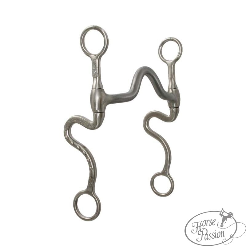 Czanka S-curve shank z portem to klasyczny bit zachodnioamerykański łączący trzy sprawdzone elementy projektowe: czanki w kształcie litery S (snake shank) wydłużające efektywne ramię dźwigni, nieruchomy port korekcyjny dający sygnał podniebienny przy sygnale wodzy oraz szeroki ścięgierz (10 mm) rozkładający nacisk równomiernie na powierzchni języka. Czanki S-curve to jeden z najczęściej spotykanych profili geometrycznych w czankach roboczych i show — sinusoidalny kształt nadaje bitu charakterystyczny wygląd zachodniego kiełzna, a jednocześnie przesuwa punkt działania ścięgierza lekko do przodu względem geometrii prostej czanki. Efektem jest delikatna zmiana momentu, w którym sygnał wodzy zaczyna aktywować port i curb strap — many trenerów ceni S-shank za nieco łagodniejszy "feel" sygnału w porównaniu do prostych czanek o tej samej długości.