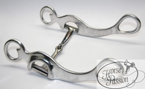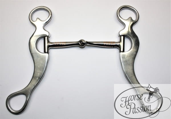 Jointed ścięgierz bez portu to boczny sygnał snaffle: bezpośredni, czytelny, bez presji na podniebienie. Miedziana beczułka na złączu centralnym leży dokładnie tam gdzie koń kontaktuje się ze ścięgierzem językiem — stymuluje żucie i produkcję śliny w najważniejszym punkcie kontaktu. Swept-back flat plate shank z charakterystycznym scroll top (zwinięte ozdobne zakończenie wycięte w płycie aluminium) to profil który delikatniej przekazuje sygnał naciągu niż pionowa czanka — ramię opada łagodnie do tyłu i w dół, co daje koniowi ułamek sekundy więcej na odpowiedź. Teardrop dolny zapewnia stabilne prowadzenie wodzy bez przesuwania. Cena 99 zł czyni z tego bita najdostępniejszą czankę snaffle w ofercie HorsePassion — bez kompromisów funkcjonalnych, z pełną miedzianą stymulacją.