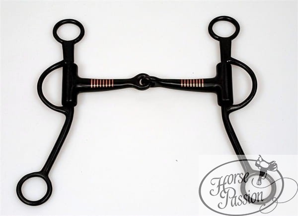 Czanka Snaffle bit podstawowa sweet iron — jointed ścięgierz bez portu z miedzianymi inlay (miedziane pierścienie na ramionach złącza), krótkie S-czanki z surowej stali (sweet iron), D-ringi górne, O-ringi dolne. Rozmiar 5" (12,7 cm) lub 5,5" (14 cm). Sweet iron celowo rdzewieją — rdzawa patyna wzmaga żucie i produkcję śliny. Budżetowa czanka treningowa do codziennego użytku. Wymaga curb strapa.
