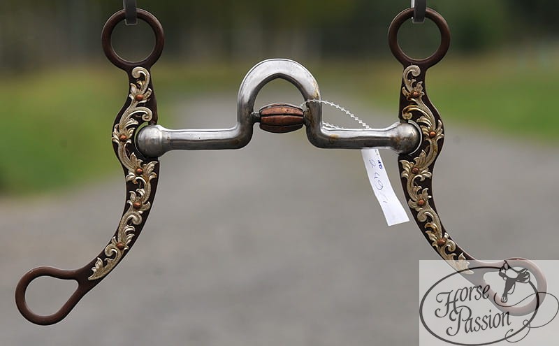 Złoto-miedziane zdobienia floral scrollwork pokrywają obie czanki — nie tylko lewą jak w standardowych show bitach. To szczegół który wyróżnia ten model: pełna symetria ozdobień tworzy efekt biżuteryjny widoczny zarówno z lewej jak i prawej strony podczas ruchu. Sweet iron (ciemna patina powierzchni) tworzy ciepłe tło które podkreśla złote motywy kwiatowe — kontrast złoto/ciemnobrąz to estetyka rodem z meksykańskich plateros i meksykańskiej tradycji vaquero, która legła u podstaw całego zachodnioamerykańskiego jeździectwa. Swept-back flat plate shank o delikatnym łuku daje proporcjonalne przełożenie — wysoki port dostarcza sygnału pionowego, czanki nie potrzebują być bardzo długie żeby działać precyzyjnie.