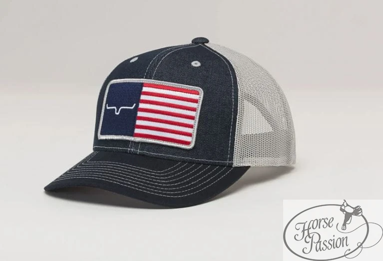 Czapka z daszkiem Kimes Ranch American Trucker — granatowy denim twill z przodu, biała oddychająca siateczka z tyłu. Haftowana naszywka z flagą USA i logo longhorns, regulowany snapback, mid-profile, zakrzywiony daszek. Oryginalny produkt Kimes Ranch, USA. Dostępna od ręki, wysyłka 48h.