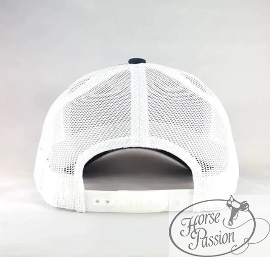 Kimes Ranch to marka z Arizony która rozumie western tak jak niewielu — jej czapki znajdziesz na arenach NRHA, przy stajniach i w kabinach pickup od Teksasu po Idaho. American Trucker to jeden z ich najbardziej rozpoznawalnych modeli — granatowy denim twill z przodu łączy się z białą siateczką która zapewnia wentylację przez całą tylną część czapki. To klasyczne połączenie truckera który wygląda poważnie, a nosi się wygodnie przez cały dzień — przy treningach, na zawodach i w drodze na rancz.