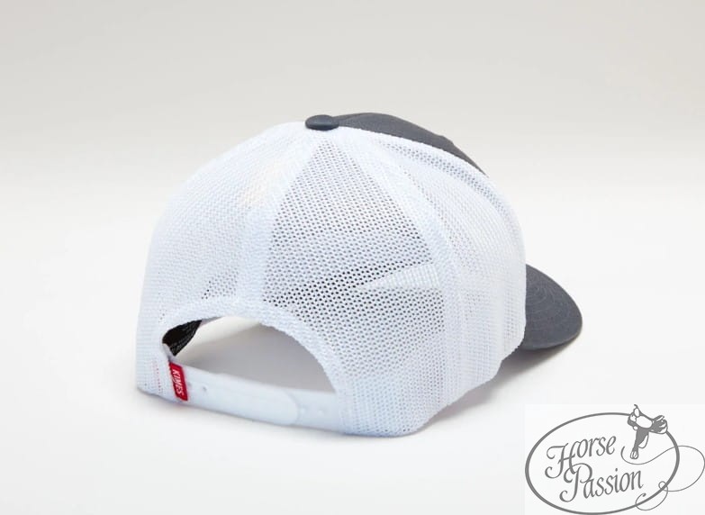 Sam fason to sprawdzony klasyk: grafitowy front panel z tkaniny twill trzyma kształt i stabilnie eksponuje naszywkę, biała siateczka z tyłu zapewnia cyrkulację powietrza przez całe popołudnie przy koniu. Zakrzywiony daszek — mid-profile — to tradycyjny trucker bez eksperymentów z flat billem. Regulowany snapback z charakterystyczną czerwoną metką Kimes dopasowuje się do każdego obwodu głowy. Grafitowo-biała kolorystyka jest neutralna i gra z każdym strojem jeździeckim, dżinsami i flanelą.