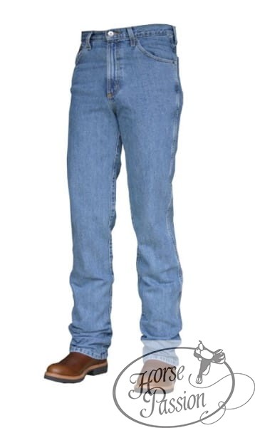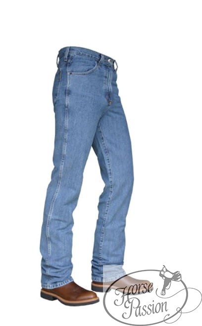 Denim 14,25 oz w 100% bawełny bez elastanu — ciężki, sztywny materiał który trzyma kształt i nie rozciąga się na kolanach po dniu w siodle. Medium stonewash daje jasny, świeży odcień który pasuje zarówno do show outfit jak i codziennego noszenia. Podwójnie szyte szwy na całej długości — standard Cinch który znacznie wydłuża żywotność parka. Klasyczny układ pięciu kieszeni z głębokimi przednimi kieszeniami. Zwężona nogawka z otwarciem 16,875" wchodzi na cholewkę kowbojki bez gromadzenia materiału.