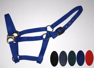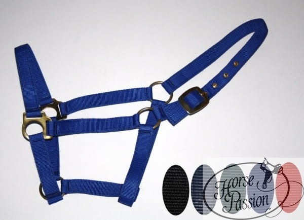 Kantar nylonowy Equi rozmiar L — mocna taśma nylonowa z mosiężnymi okuciami i nitami. Klasyczny model do codziennego użytku w stajni. Kolor ciemnoniebieski.