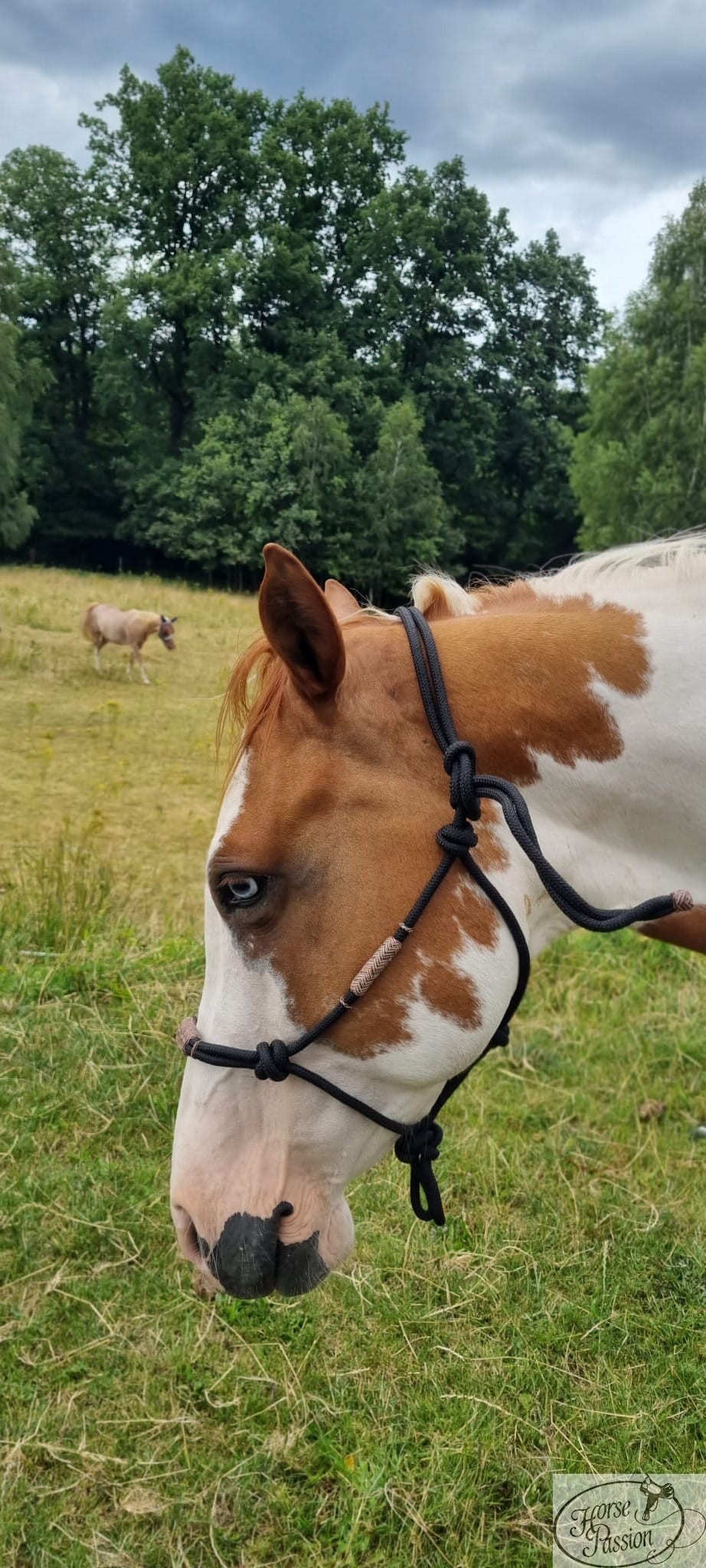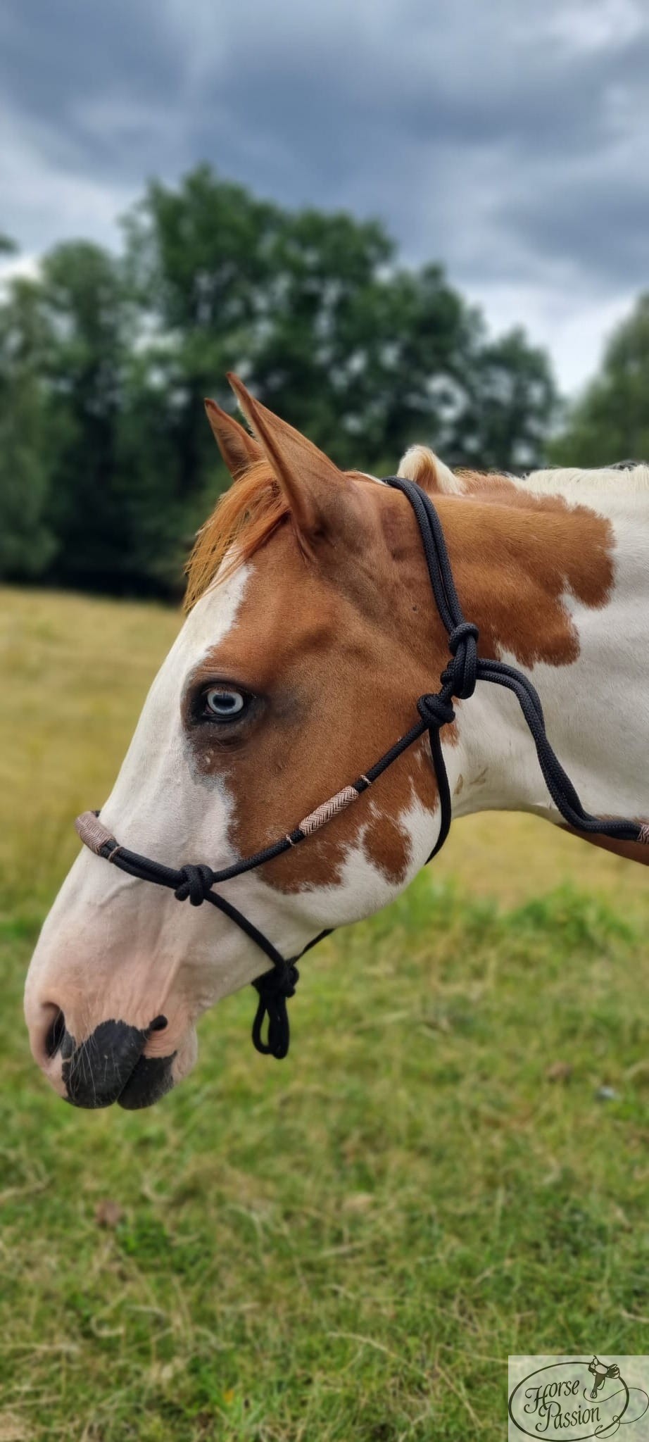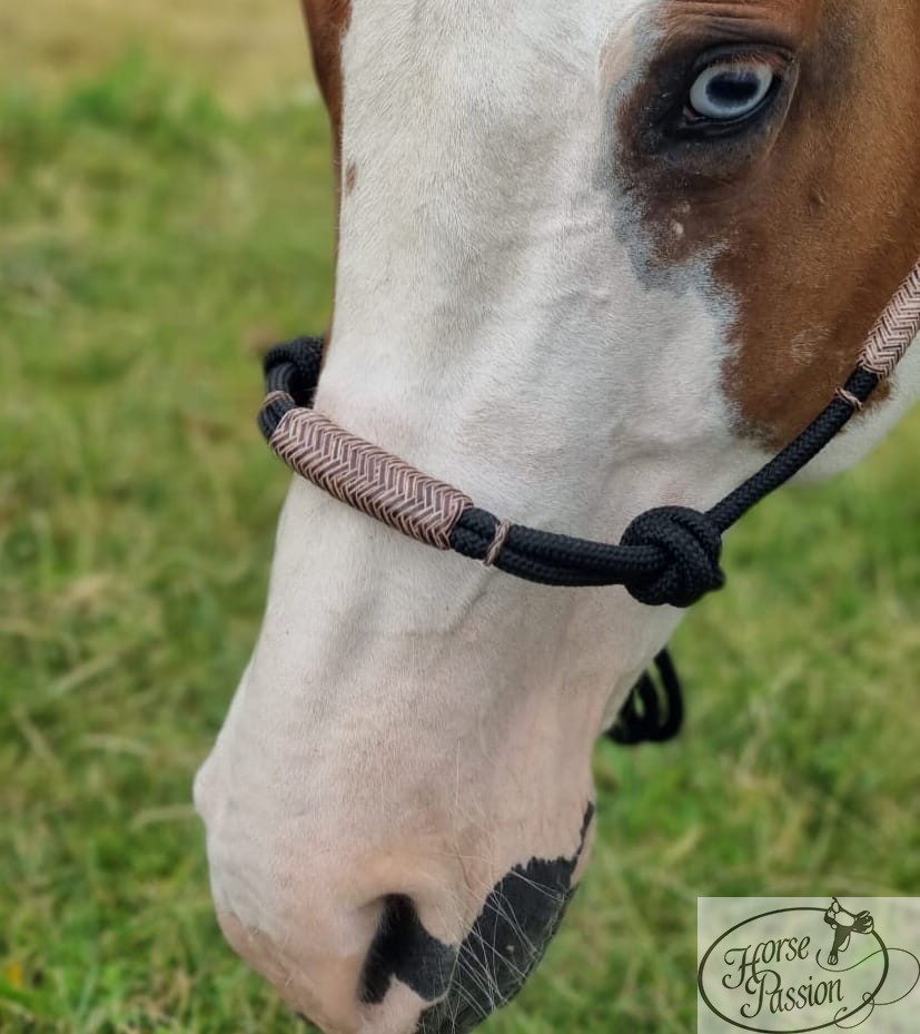 Wzmocnienia ze surowej skóry na paskach policzkowych pełnią inną funkcję: usztywniają boczne pasy kantara i utrzymują precyzyjną geometrię węzłów niezależnie od wilgoci i użytkowania. Czarna linka i naturalny brązowy rawhide tworzą estetyczny kontrast — kantar wygląda tak samo dobrze na padoku jak w trakcie pracy. Na zdjęciach widać, jak naturalnie leży na głowie konia bez uciskania uszu i jak perfekcyjnie prezentuje się na tobiano z niebieskim okiem.