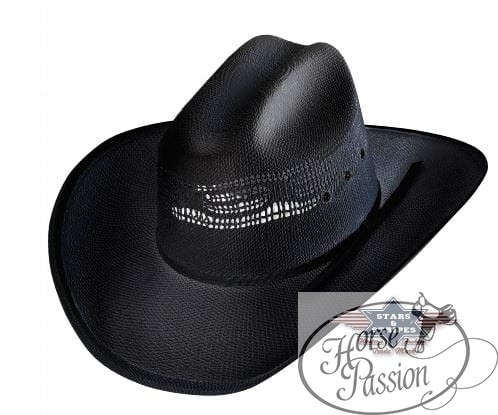 Kapelusz westernowy Stars & Stripes Ashton czarny — 100% słomka w fasonie cattleman z ażurową wentylacją w koronie. Czarny dekoracyjny pasek z logo Stars & Stripes, miękka regulowana opaska wewnętrzna. Odporny na odkształcenia, lekki, przewiewny — idealny na upalne dni w terenie i na zawody rekreacyjne. Rozmiary 53–61.