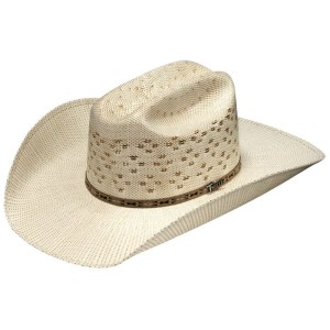 Kapelusz westernowy Twister Bangora słomkowy — dwukolorowy splot bangora w odcieniach naturalnym i brązowym z ażurową wentylacją w koronie. Otwarta korona (open crown) do formowania według własnych preferencji, rondo 4 1/4" (~11 cm), 2-sznurkowy pasek z Twister pin, wewnętrzna opaska Comfort Sweat Shield. Oryginalny produkt M&F Western Products, USA.