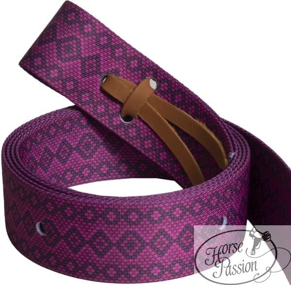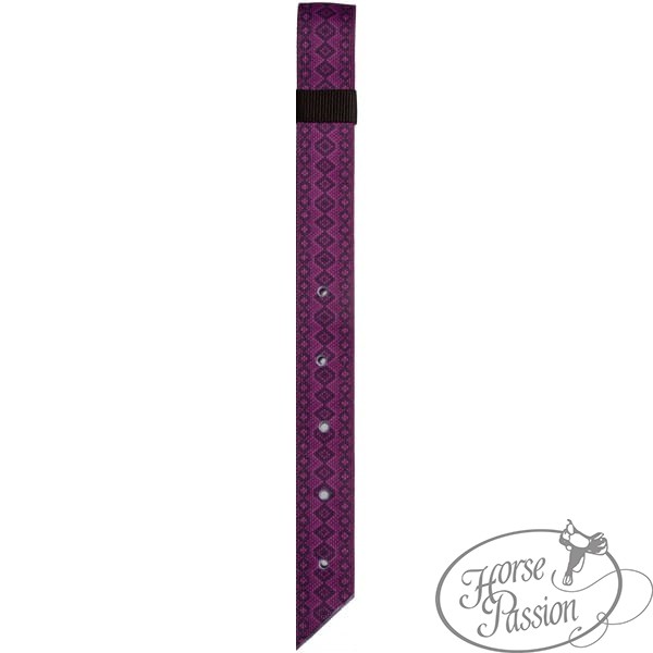 Komplet pasków do popręgu (tie strap + off billet) nylonowy Mustang — tie strap do lewej strony siodła i off billet do prawej strony w jednym zestawie. Geometryczny wzór diamentowy w kolorze fioletowo-czarnym na całej długości, skórzane końcówki w kolorze tan. Kolorystyczne wyróżnienie zestawu siodłowego przy zachowaniu pełnej funkcjonalności.