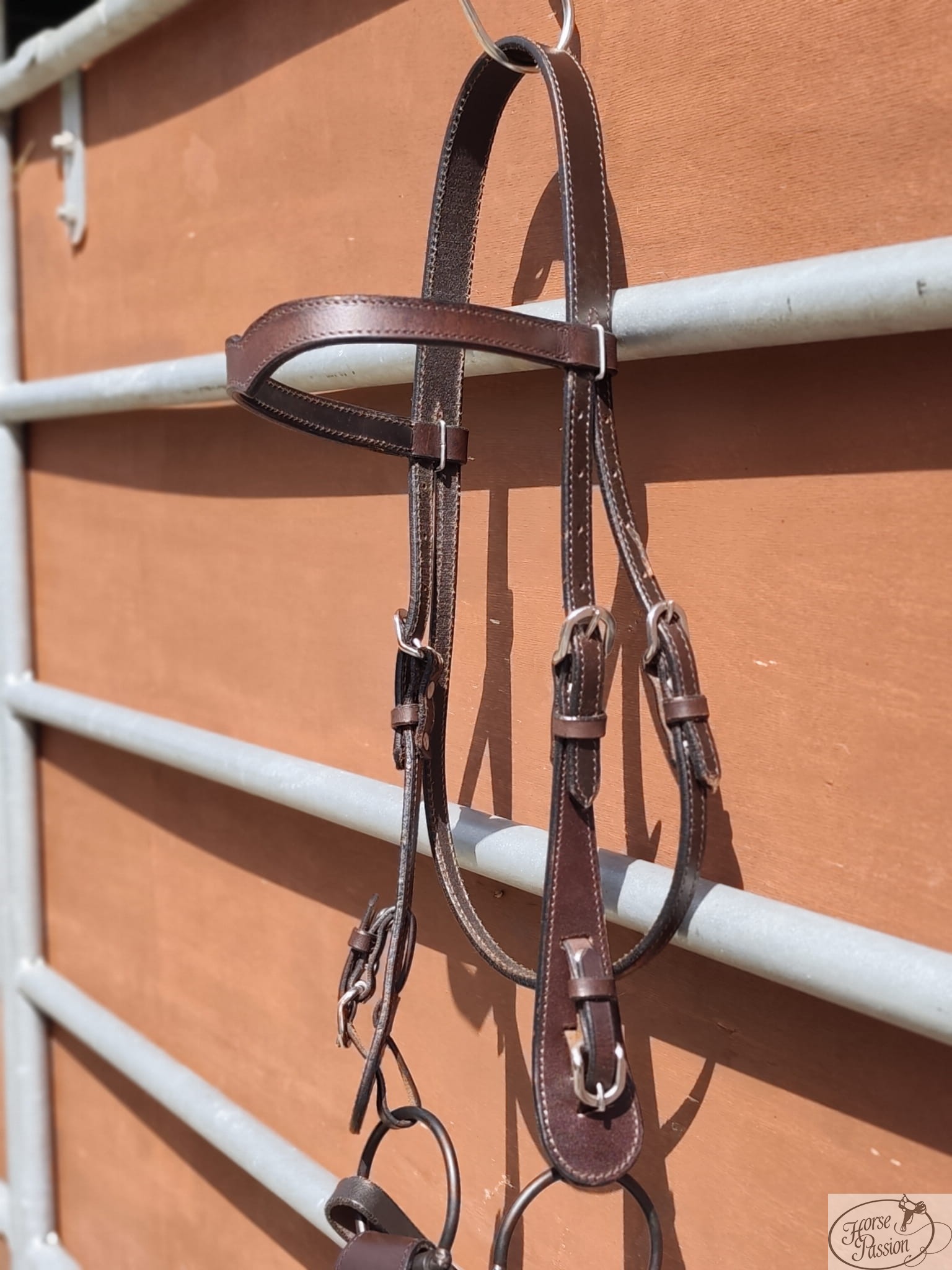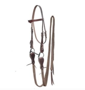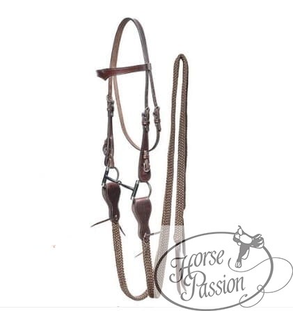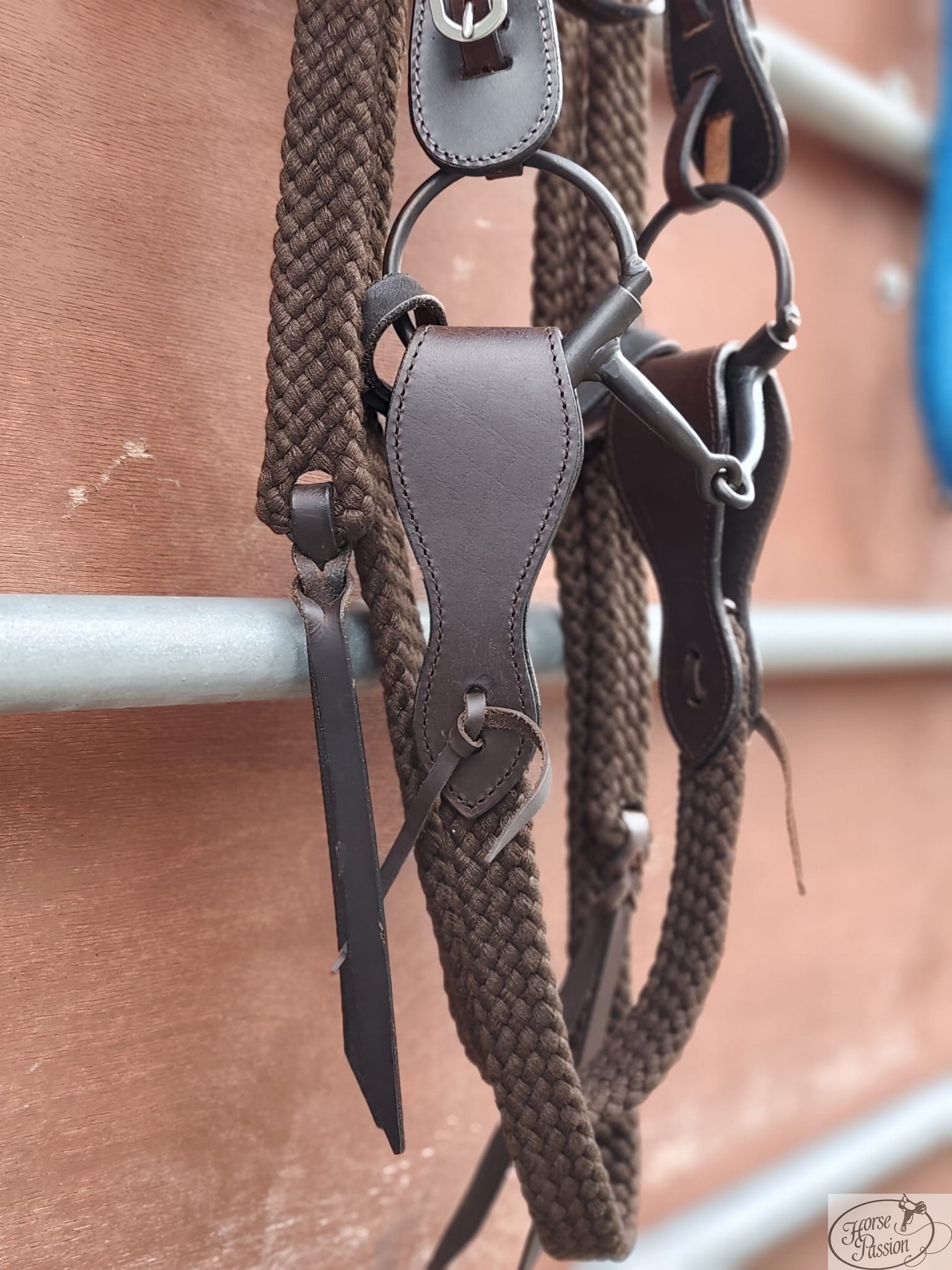 Kompletny zestaw ranczerski w stylu vaquero — ogłowie z naczółkiem futurity V na ciemnej skórze, plecione wodze brązowe ze skórzaną końcówką, wędzidło O-ring snaffle ze słodkiego żelaza (sweet iron), skórzany curb strap. Clip-klamra przy wędzidle dla szybkiej wymiany. Rozmiar FULL.