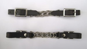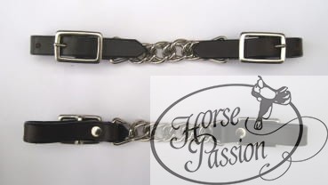 Łańcuszek podbródkowy (curb chain) EE Tack — pojedynczy łańcuch stalowy z ciemnobrązowymi skórzanymi paskami z olejowanej skóry (miękkie i elastyczne od pierwszego użycia) oraz prostokątnymi srebrnymi klamrami. Niezbędne akcesorium do każdej czanki z dźwignią.