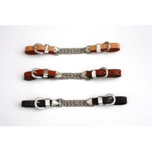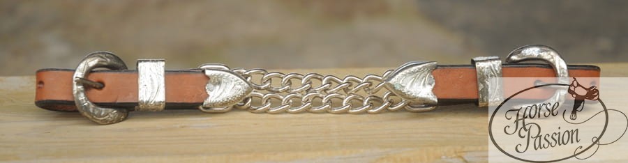 Łańcuszek pod czankę show Equi — podwójny łańcuch chromowany ze skórzanymi ramionami regulowanymi sprzączkami z grawerem scrollwork i srebrnymi zdobionymi bloczkami łączącymi. Dostępny w 3 kolorach skóry: jasny (natural), kasztan, ciemny. Obowiązkowy akcesoria do każdej czanki westernowej — show wykonanie. 65 zł.
