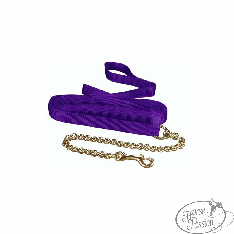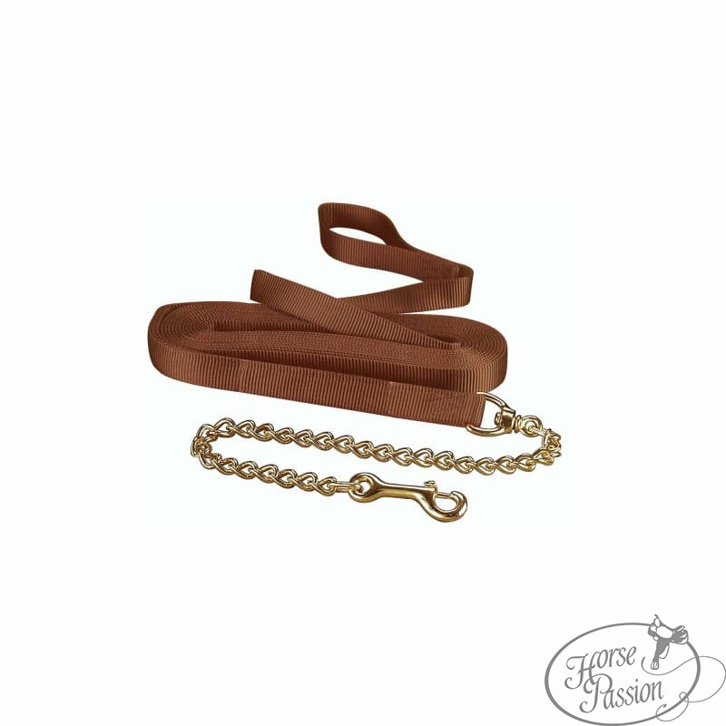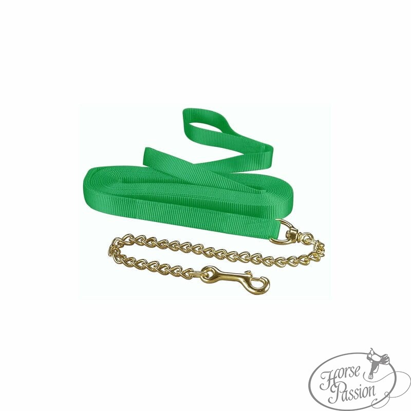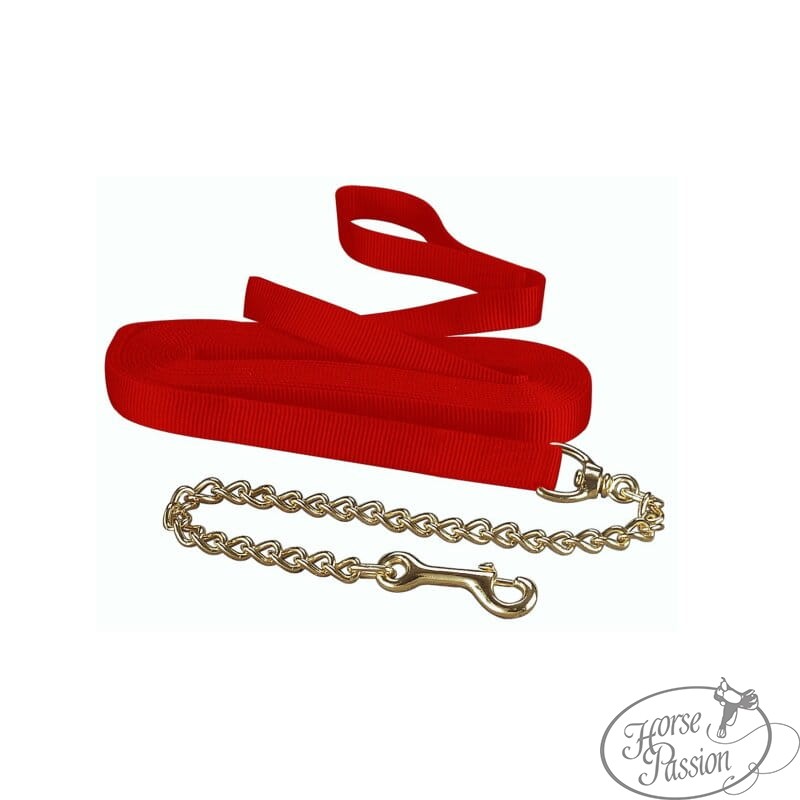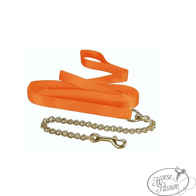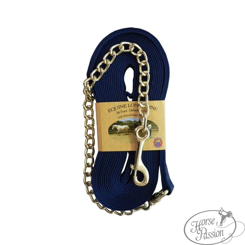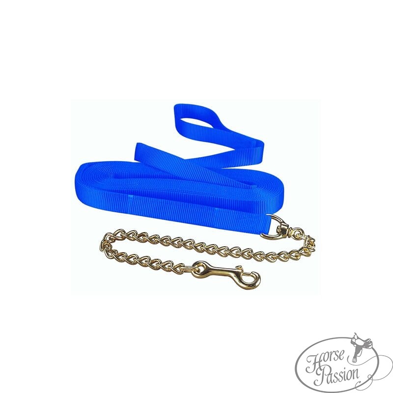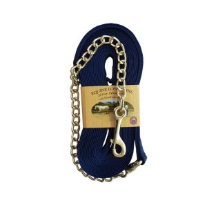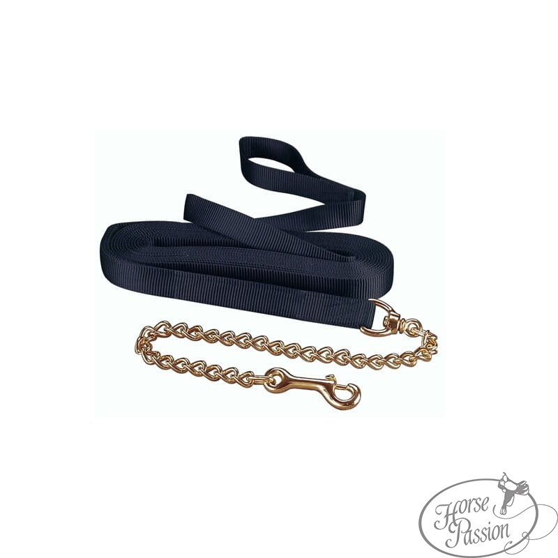 Lonża nylonowa Hamilton USA z łańcuszkiem — taśma nylonowa 1" z łańcuszkiem 24" i obrotowym karabińczykiem bolt snap. Szwy box-stitch wzmacniają punkty naprężeń. Długość 26 ft (ok. 7,9 m) do lonżowania na pełnym kole. Dostępna w wielu kolorach.