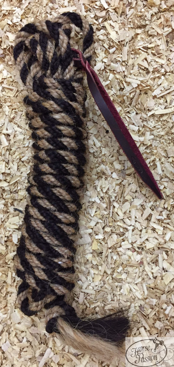 Grubość mecate wpływa na wagę, opad i czucie sygnału. Standardowe mecate z końskiego włosia mają zwykle grubość ok. 1/2" (12 mm) lub więcej. Extra thin 3/8" jest wyraźnie cieńsze — co oznacza mniejszą wagę i delikatniejsze czucie przy boku nosa konia przy każdym sygnale bocznym. Kilka sytuacji, gdy extra thin jest właściwym wyborem: