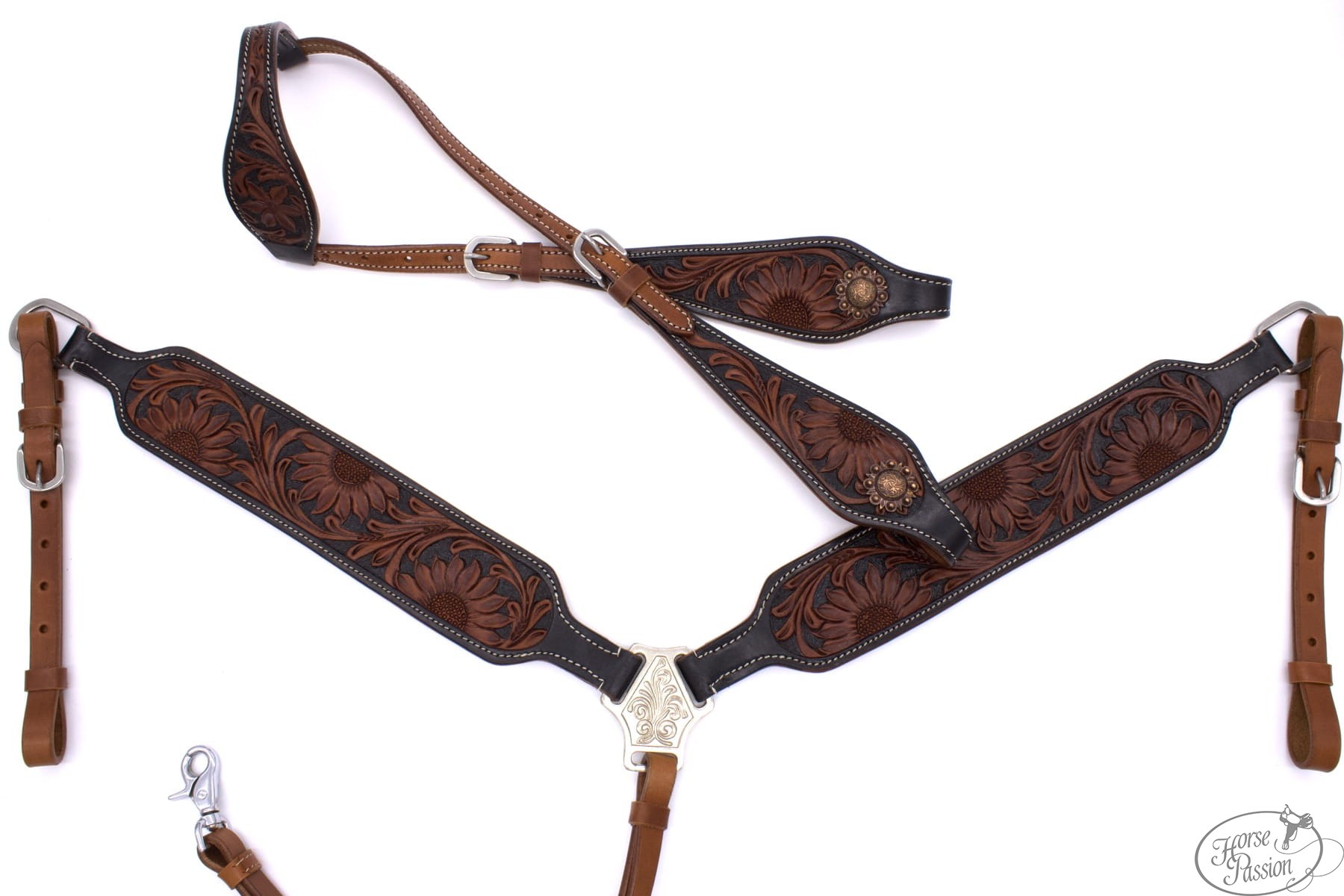 Ogłowie na jedno ucho z conchami w kolorze miedzi z pięknym kwiatowym tłoczeniem idealnie pasujące do napierśnika.