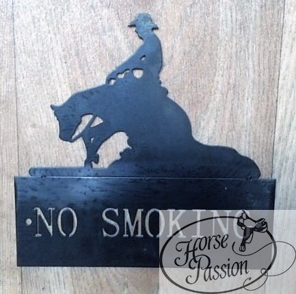 Napis „NO SMOKING – reining” pełni funkcję informacyjną, wskazując zakaz palenia w danym miejscu. Może być stosowany w stajni, przy boksach, w siodlarni lub na zapleczu zawodów.