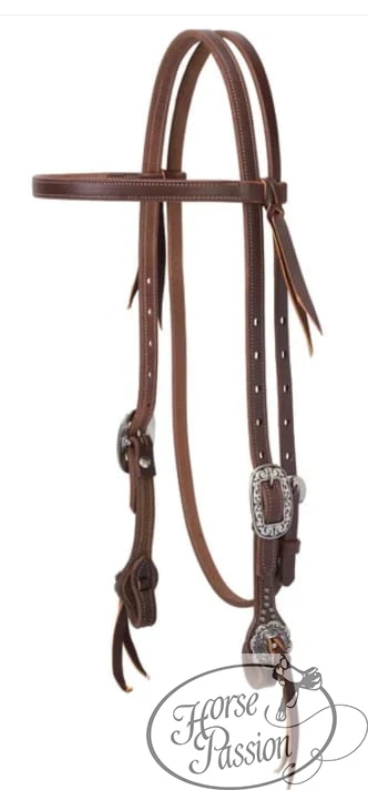 Water tie bit ends to skórzane końcówki przy wędzidle zaprojektowane z myślą o szybkim montażu i demontażu wędzidła bez przeplatania latigo — koniec paska ma specyficzne nacięcie i pętelkę, które pozwalają zapiąć wędzidło sprawnie jedną ręką nawet w rękawicach. Ozdobne srebrne klamry z arabeską przy policzkach mają głęboko tłoczony wzór scroll — klasyczny detal zachodni, który pasuje zarówno do jazdy roboczej, jak i do lżejszego show. Białe przeszycia krawędziowe na całej długości pasków. Małe srebrne dots na Spanish-cut końcówkach policzka.