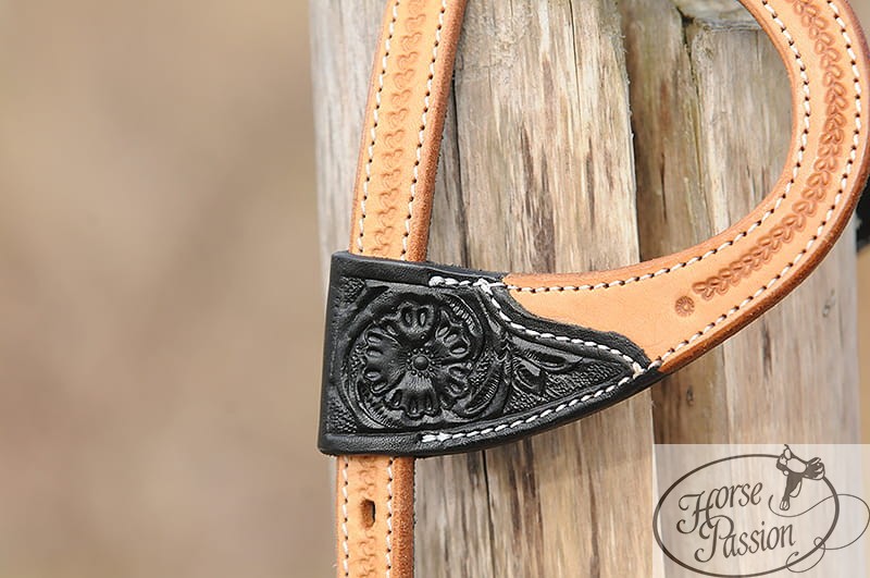 | Zdobienia | Floral tooling (motyw kwiatowy) na czarnych elementach; basket tooling na krawędzi pętli usznej |