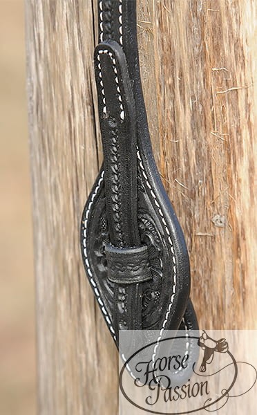 Czarne elementy — trójkątny keeper na złączeniu z pętlą uszną oraz bit end na końcu policzka — wykonane są z rzeźbioną dekoracją floral (kwiatowy motyw z centralną rozetą i liśćmi akantu), połączone białymi przeszyciami. Ten sam detal zdobniczy pojawia się spójnie w dwóch kluczowych punktach ogłowia, dając efekt starannie zaprojektowanego zestawu, a nie przypadkowego łączenia elementów. Mechanizm szybkiej wymiany wędzidła oparty jest na skórzanej szlufce — pętli wsuwnej w bit endzie, którą wysuwa się bez narzędzi, zwalniając pierścień wędzidła w kilka sekund. Rozwiązanie sprawdzone w stajniach treningowych, gdzie zmiana wędzidła między końmi lub klasami jest codziennością.