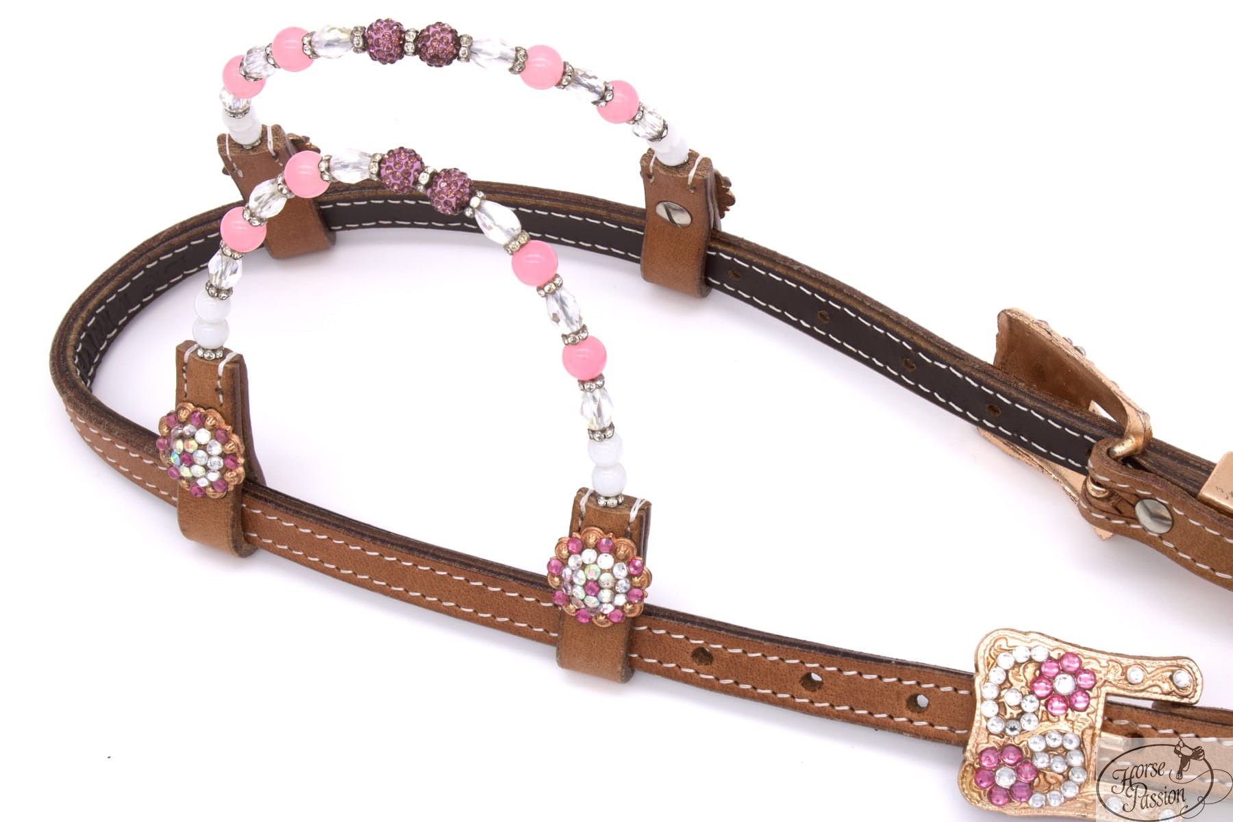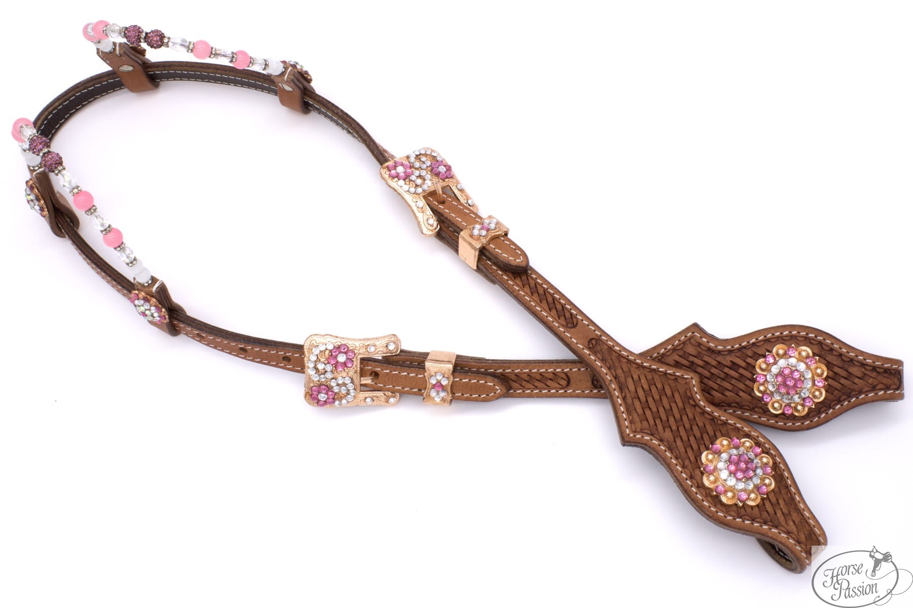 Sprzączki prostokątne w wykończeniu rose gold (różowe złoto) wysadzane są kryształkami układającymi się w kwiatowy wzór — różowe w centrum, bezbarwne wzdłuż krawędzi. Ten sam motyw kwiatowy z kryształków pojawia się na owalnych concho na shaped bit endach: różowe kryształki + złote imitacje pereł jako tło. Basket weave tooling na skórze (gęsty wzór plecionki koszyczkowej tłoczony na całej powierzchni policzków i bit endów) pełni rolę faktury kontrastowej wobec metalicznych detali — skóra bez gładkich płaszczyzn sprawia, że światło rozprasza się równomiernie, a nie błyska refleksami. Białe przeszycia wzdłuż krawędzi zamykają kompozycję czystą linią.