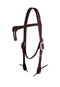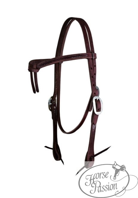 Westernwelt to producent sprzętu western z długim stażem i bardzo dużą bazą odbiorców w Europie, znany z rygorystycznej kontroli surowców — stąd wybór Hermann Oak zamiast tańszej skóry azjatyckiej. Naczółek futurity V jest wiązany (knotted) — przy podstawie V widoczne są dyskretne knoty ze skóry, które wzmacniają punkt największego naprężenia. To konstruktywna odpowiedź na najczęstsze miejsce pęknięcia futurity browband w tańszych ogłowiach. Wiązane mocowanie wędzidła zamiast klamry lub zatrzasku — tradycyjne, bez ruchomych elementów metalowych, które mogą korodować lub się zatrzeć. Klamry ze stali nierdzewnej. Białe przeszycia krawędziowe. Rozmiar medium.