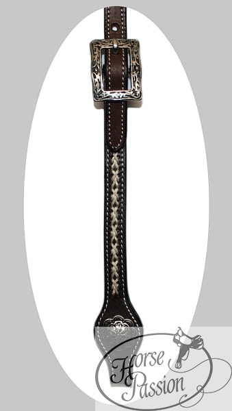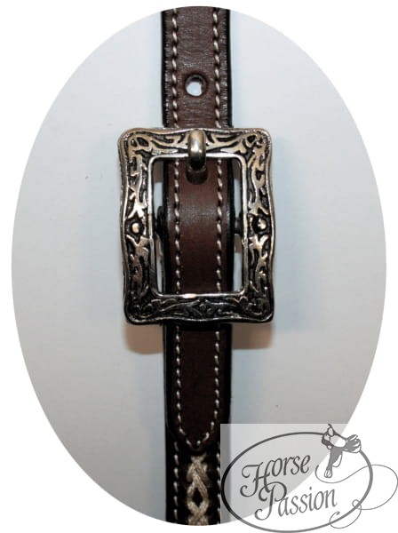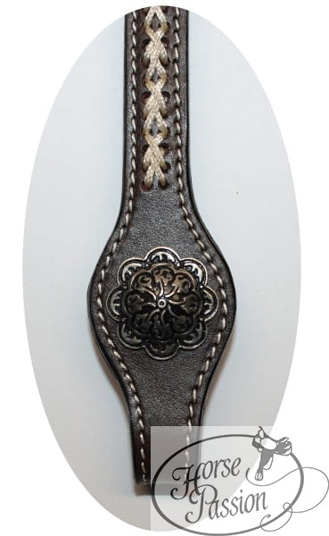 Skóra jest ciemna, czekoladowa — olejowana do głębokiego brązu, który dobrze kontrastuje z białą plecionką i kremowymi przeszyciami krawędziowymi. Srebrne klamry przy policzkach mają głęboki tłoczony wzór arabeska w prostokątnej ramce — ozdobne, ale nie krzykliwe. Końcówka policzka przy wędzidle ma Spanish-cut (łopatka) — charakterystyczne rozszerzenie i zwężenie, które w tradycyjnym rzemiośle western-show jest znakiem wyższego wykończenia. Na tym rozszerzeniu siedzi antyczna concha kwiatowa z ciemnym wykończeniem, dopasowana kolorystycznie do ciemnej skóry. Rozmiar COB odpowiada koniom o smukłych, lekkich głowach — arabom, małym Warmbloodom, Quarter Horsom o węższej głowie.