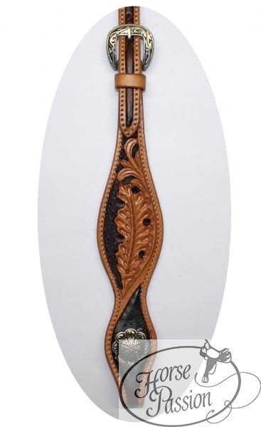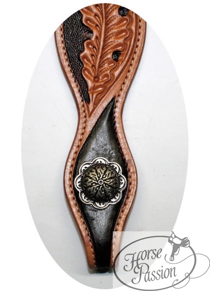 Ogłowie western jedno ucho Equi SHOW to model zaprojektowany z myślą o ringu — każdy detal jest tu celowy: dwukolorowe zestawienie naturalnej skóry tan z rzeźbą i czarnej fakturowanej skóry jako inlay tworzy głębię wizualną, która na ringu działa lepiej niż samo srebro, bo jest widoczna zarówno z bliska jak i z odległości kilkunastu metrów. Motyw toolingowy to rzeźbiony liść dębu (oak leaf) — jeden z klasycznych wzorów amerykańskiego siodlarstwa, rozpoznawalny po charakterystycznej karbowanej krawędzi liścia i organicznym, trójwymiarowym reliefie. Rzeźba wykonana jest na naturalnej skórze tan, w oprawie czarnej fakturowanej skóry jako inlay — kontrast materiałów podkreśla wzór bez potrzeby stosowania farb ani barwników.