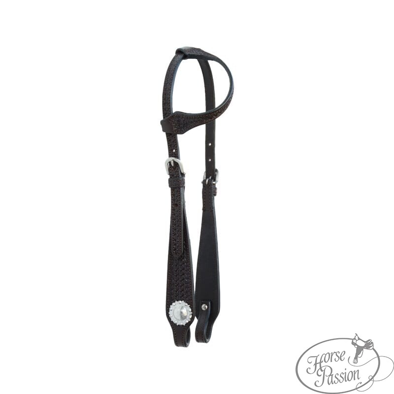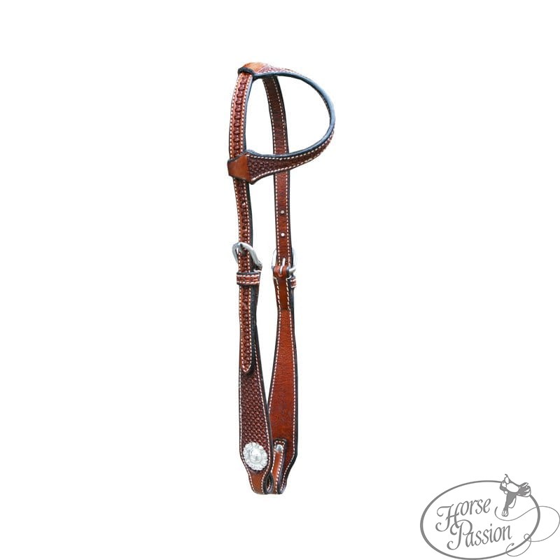 Ogłowie western jedno ucho z basket weave toolingiem i srebrnym concho kwiatowym — gęsty wzór koszyczkowy na crownpiece, pętli usznej i policzkach, okrągłe srebrne concho na shaped bit endzie, białe przeszycia, srebrna owalna klamra, końce na wiązanie (tie ends). Dostępne w trzech kolorach: jasny, kasztan i ciemny. Rozmiar medium — pasuje na AQH, Arab, Haflinger i konie o podobnej budowie głowy.