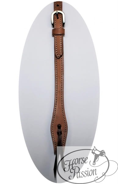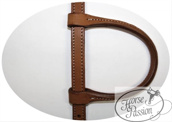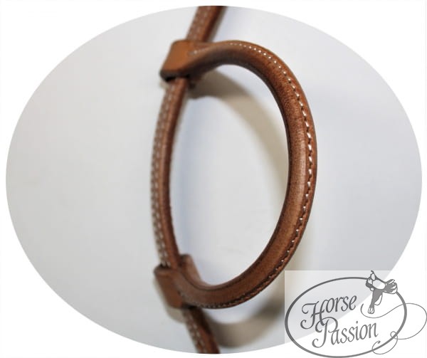 Pętla uszna jest formowana — nie jest płaskim paskiem przeprowadzanym za uchem konia, lecz D-kształtnym elementem sformowanym z grubszego paska skóry i sszytym wzdłuż krawędzi. Taki kształt rozkłada nacisk równomiernie po obwodzie ucha konia zamiast na wąskiej linii kontaktu płaskiego paska — mniej irytacji, lepsze trzymanie ogłowia, wygodniejszy kontakt przy długim użytkowaniu. Dwie sprzączki regulacji policzka. Spanish-cut końcówka przy wędzidle z latigo tie ends. Białe przeszycia krawędziowe na całym ogłowiu. Rozmiar COB.