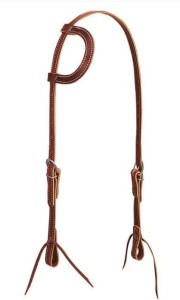 Ogłowie western Weaver one ear z przesuwaną pętlą uszną (sliding ear) — pętla uszna przesuwa się swobodnie wzdłuż czepca, dwie sprzączki regulacji policzka, skóra latigo kasztan, 5/8", laced loops latigo przy wędzidle, niklowane okucia. Rozmiar COB.
