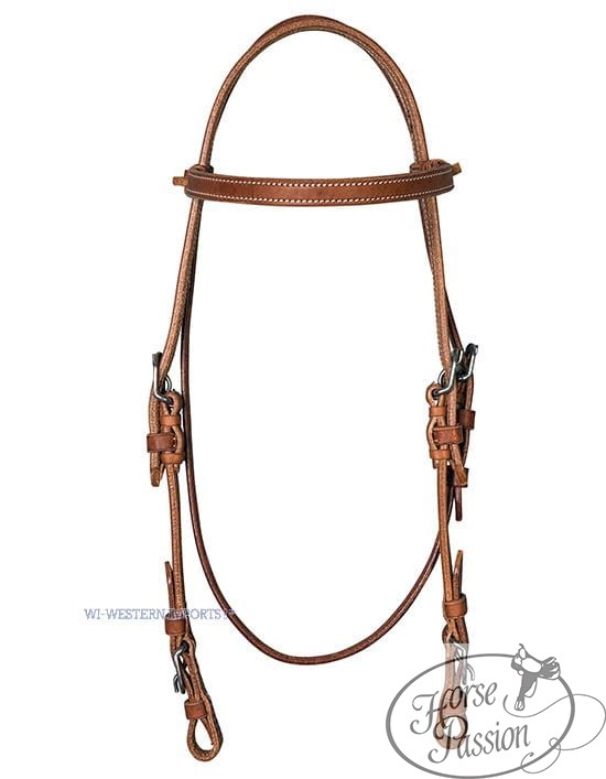Ogłowie western z naczółkiem roper (owalnym) z wysokiej jakości amerykańskiej skóry harness — naturalna miodowa barwa, białe przeszycia, czarne zatrzaski przy wędzidle dla szybkiej wymiany bitu.