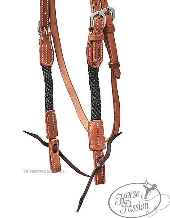 Ogłowie western z jasnej skóry honey z czarną plecionką nylonową wzdłuż naczółka i policzków — nylon odporny na wilgoć i ścieranie, skóra honey elastyczna i klasyczna w wyglądzie, srebrne klamry, białe przeszycia, latigo tie ends. Western Imports. Rozmiar COB.