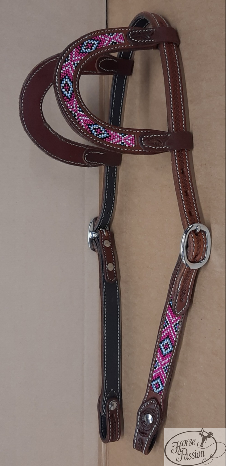 Ogłowie western two ear GVR beadwork różowy wzór Navajo kasztan COB do kompletu z napierśnikiem