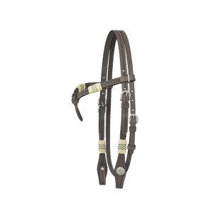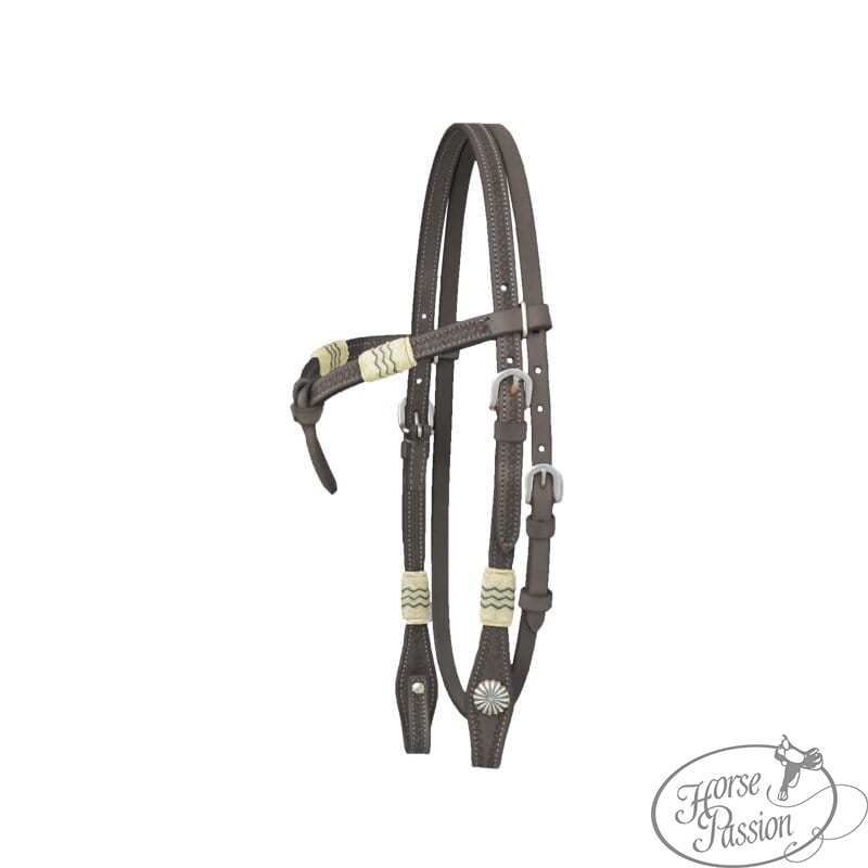 Ogłowie western z naczółkiem — ciemnoczekoladowa skóra z plecionym warkoczem z surowej skóry (rawhide) na naczółku i paskach policzkowych, tworzącym kremowy wzór fali na ciemnym tle. Srebrne kwadratowe klamry i antyczne concho słonecznikowe na końcówkach przy wędzidle.