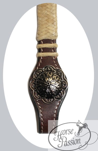 Ogłowie western z naczółkiem ze splecionej surowej skóry (rawhide) na ciemnej olejowanej skórze — ozdobna klamra z arabeską, kwiatowa concha, kremowe przeszycia. Rawhide na naczółku to tradycyjny detal rzemiosła western, który nie wymaga olejowania i zachowuje sztywność przez lata.