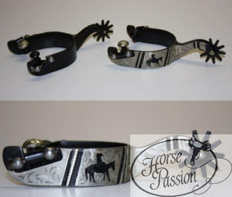 Ostrogi western Equi Pleasure czarne, srebrne pasy, sylwetka jeźdźca