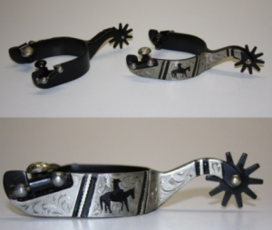 Ostrogi western Equi Pleasure — czarna stal z trzema poprzecznymi srebrnymi pasami, srebrnym scrollwork i sylwetką jeźdźca western na koniu. Rowel 12-ramienny czarny, srebrne guziki. Przeznaczone do western pleasure i show. Dostępne od ręki.
