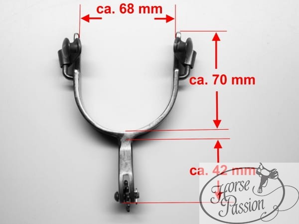 Wykończenie antique — ciemna, matowa stal szara — to klasyka roboczego sprzętu western, który wygląda "noszony" już od pierwszego dnia. Rowel 10-ramienny stalowy z zaokrąglonymi czubkami daje delikatne, precyzyjne działanie odpowiednie dla młodego jeźdźca uczącego się pracy ostrogami. Shank prosty i krótki (42 mm) minimalizuje ryzyko przypadkowego kontaktu. Stalowe guziki mocujące pasek.
