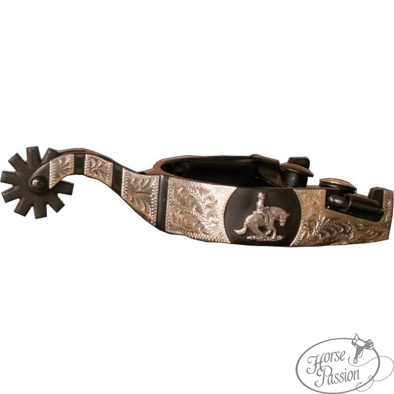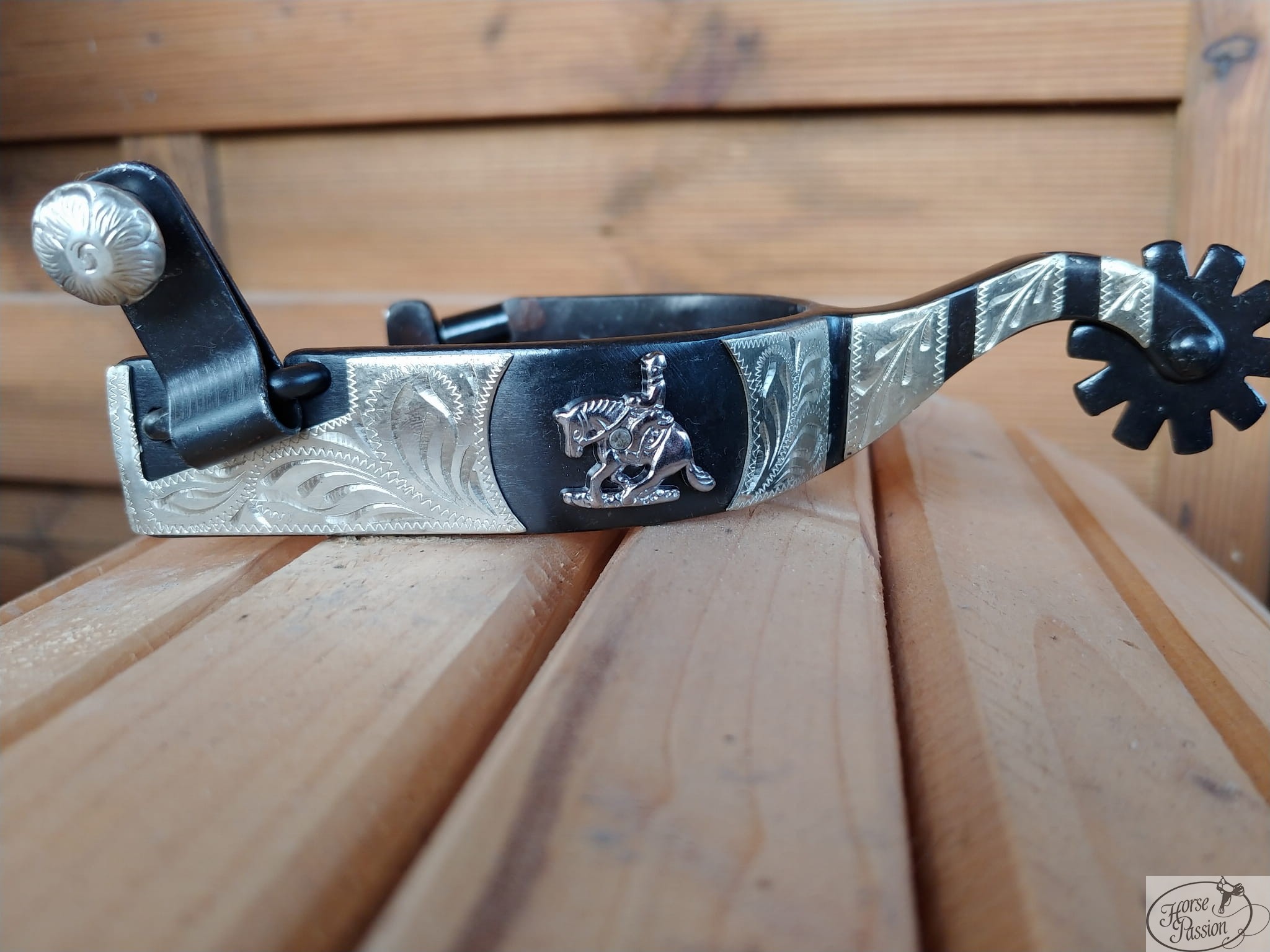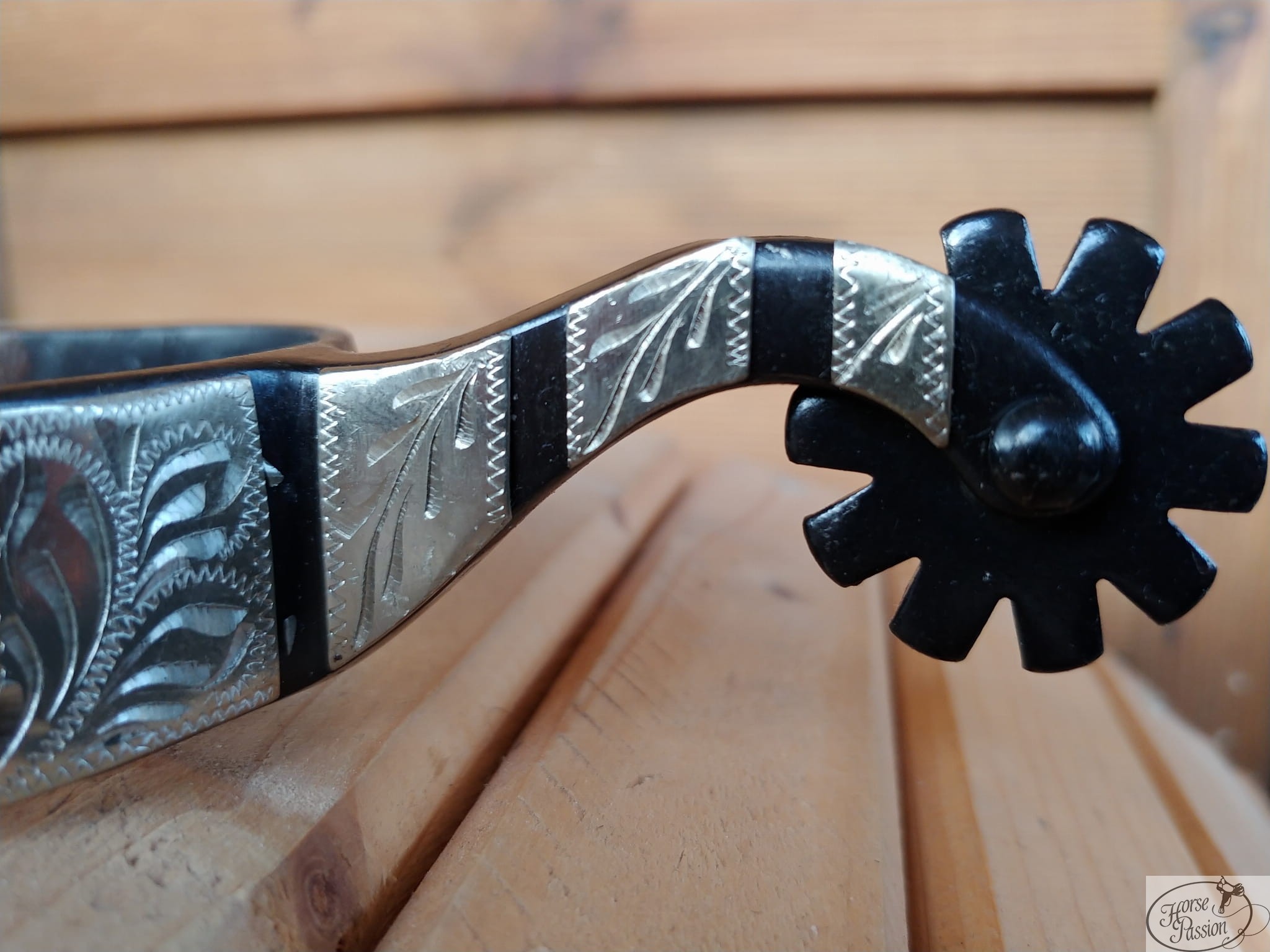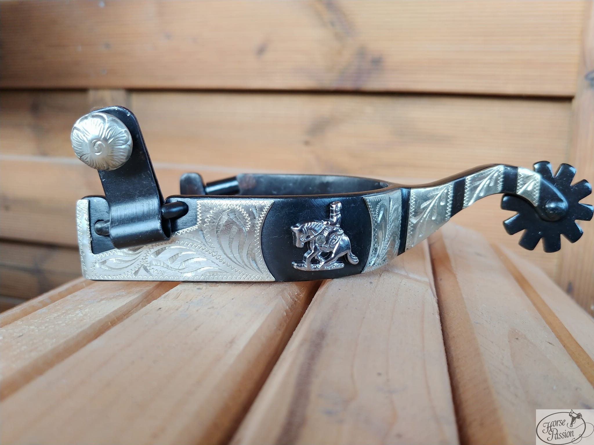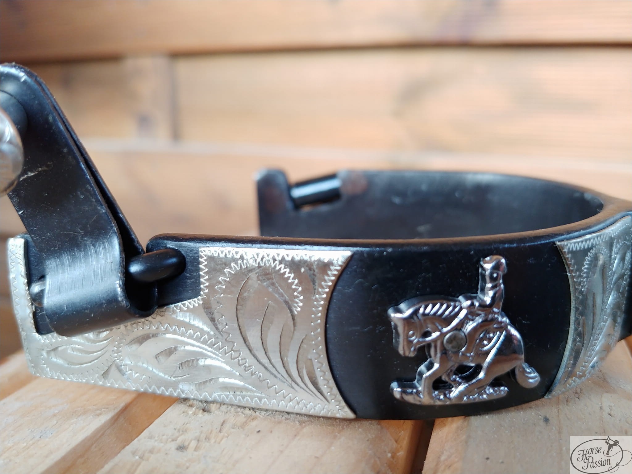 Ostrogi western reining Equi Sliding Stop czarne, silver scrollwork, motyw sliding