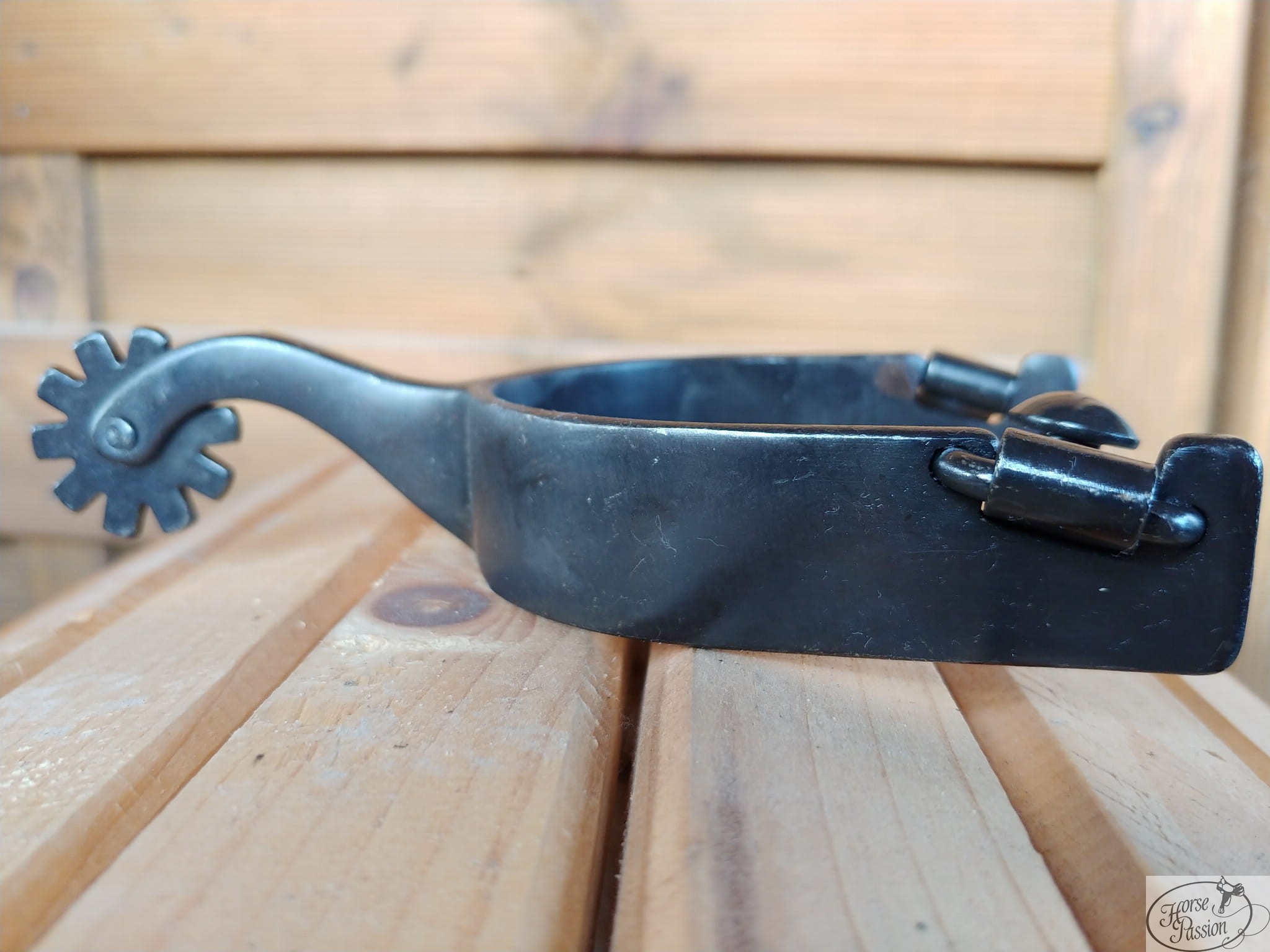 Ostrogi western Equi Sliding Stop to model stworzony z myślą o zawodnikach reiningu — i jedyne ostrogi w ofercie HorsePassion z motywem sliding stop. Centralny medalion na czarnej stali przedstawia sylwetkę konia w charakterystycznej pozycji sliding stop — zatrzymanie z wysuniętymi tylnymi kończynami pod tułów, typowe dla reiningu. To detal dla tych, którzy traktują ostrogi nie tylko jako narzędzie ale i element tożsamości jeźdźca reiningowego.