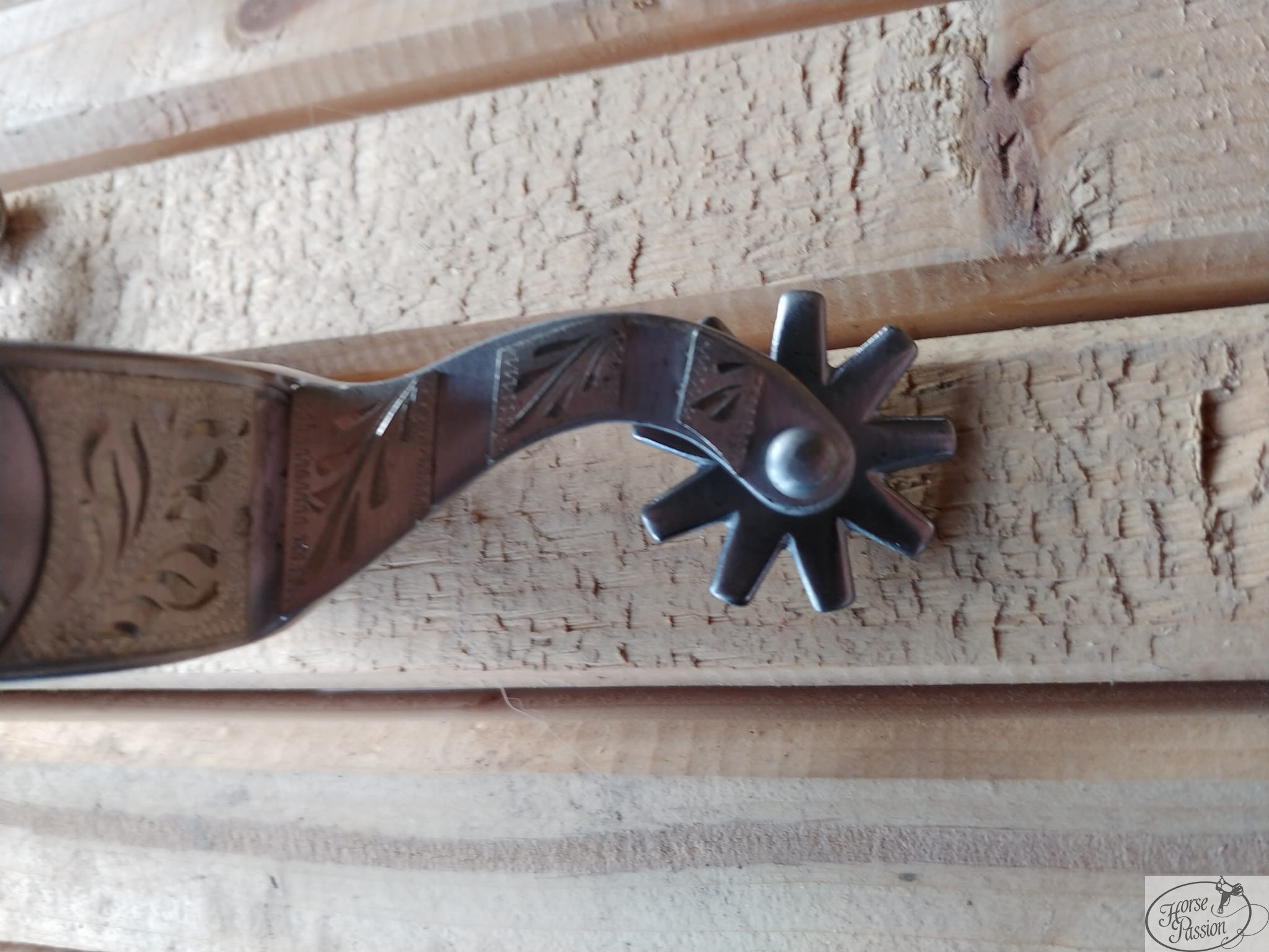 Ostrogi western sliding stop Equi — stal nierdzewna z głęboko grawerowanym wzorem floral na całej bandzie i centralnym medalionem przedstawiającym konia w sliding stopie. Rowel 10-punktowy średniomocny, lekko wygięty trzonek do środka ok. 5 cm, banda ok. 2,4 cm. Bestseller Equi w Europie. Para, wysyłka 48h.