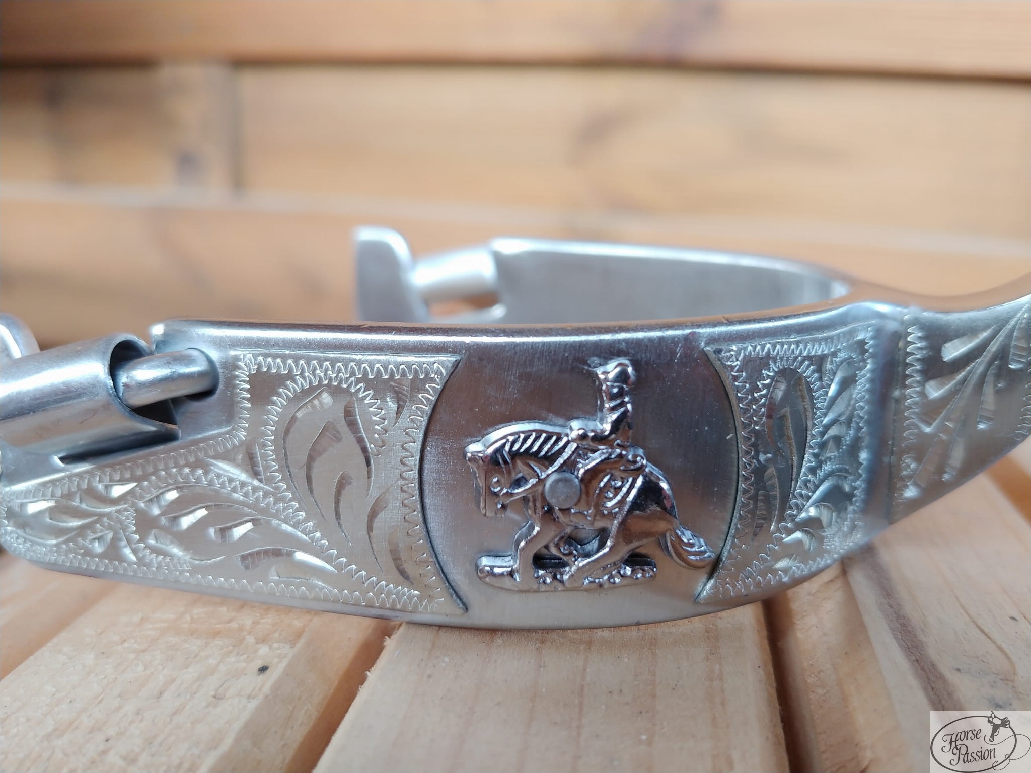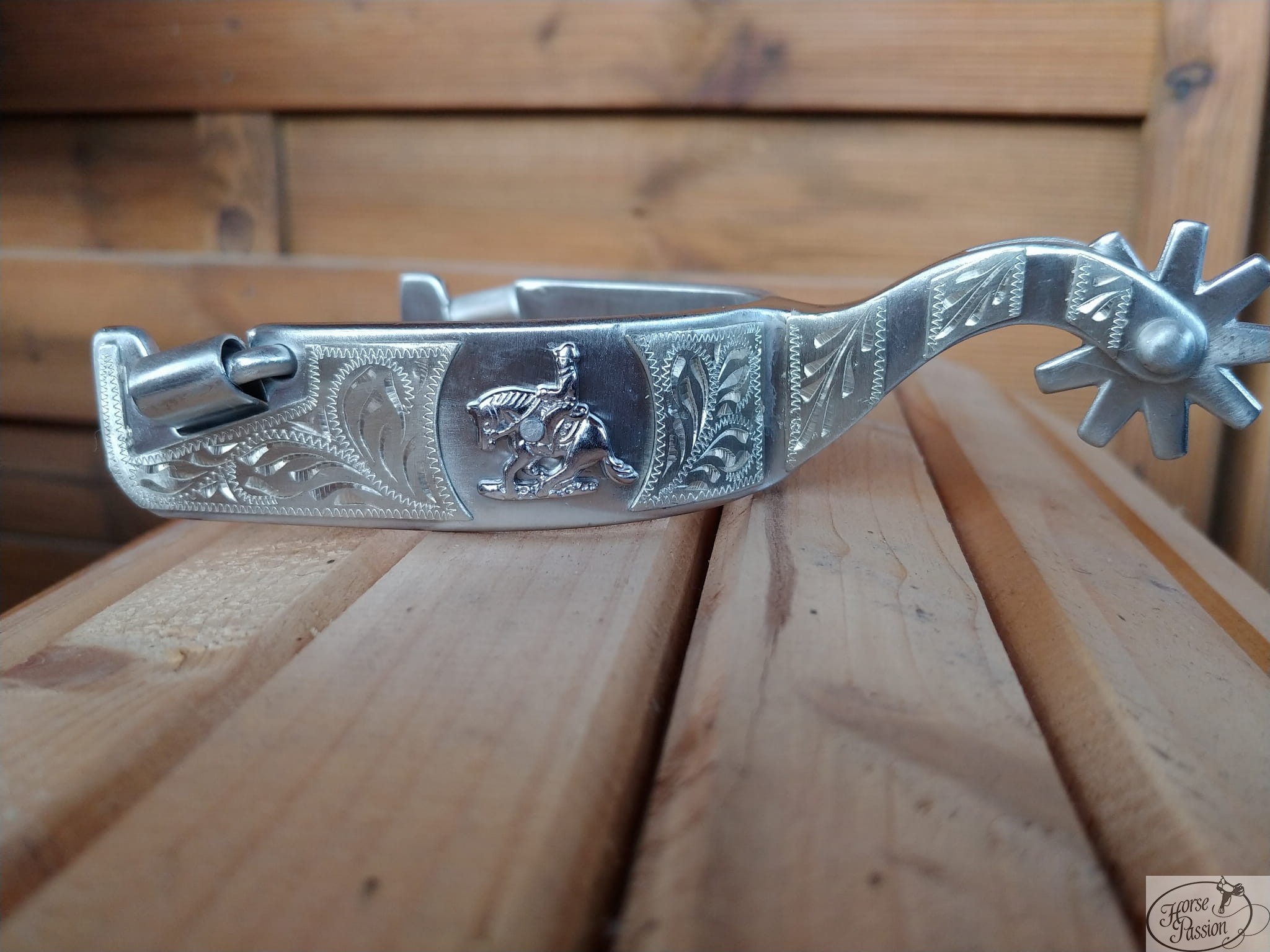 Koń w sliding stopie na centralnym medalionie — ostrogi dla jeźdźca, który swój sport nosi przy sobie nawet w ringu. Wykonane ze stali nierdzewnej z głęboko grawerowanym wzorem floral pokrywającym całą powierzchnię bandy i trzonka. Centralny element to owalny medalion z reliefem przedstawiającym konia i jeźdźca w momencie sliding stop — charakterystycznym zahamowaniu z tylnych nóg, będącym wizytówką reiningu jako dyscypliny. Motyw ten natychmiast sygnalizuje przynależność jeźdźca do świata reiningu i tradycji pracy z bydłem, z której ta dyscyplina się wywodzi.