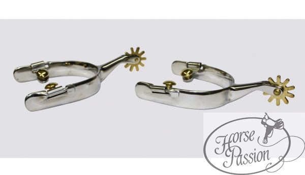 Ostrogi western treningowe Equi NP — stal szlachetna z mosiężnym rowelem 10-ramiennym. Lekkie, minimalistyczne, bez zdobień. Idealne jako pierwsze ostrogi western lub dla młodszych jeźdźców. Dostępne od ręki.